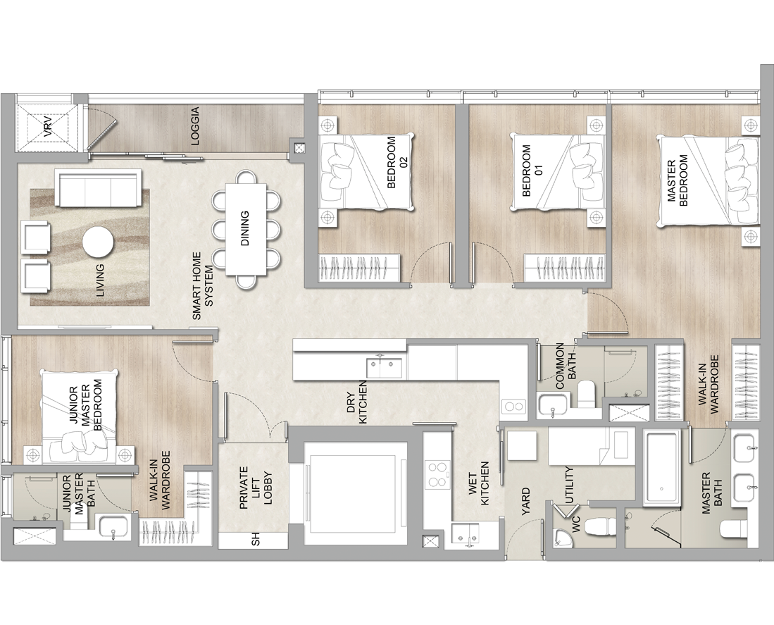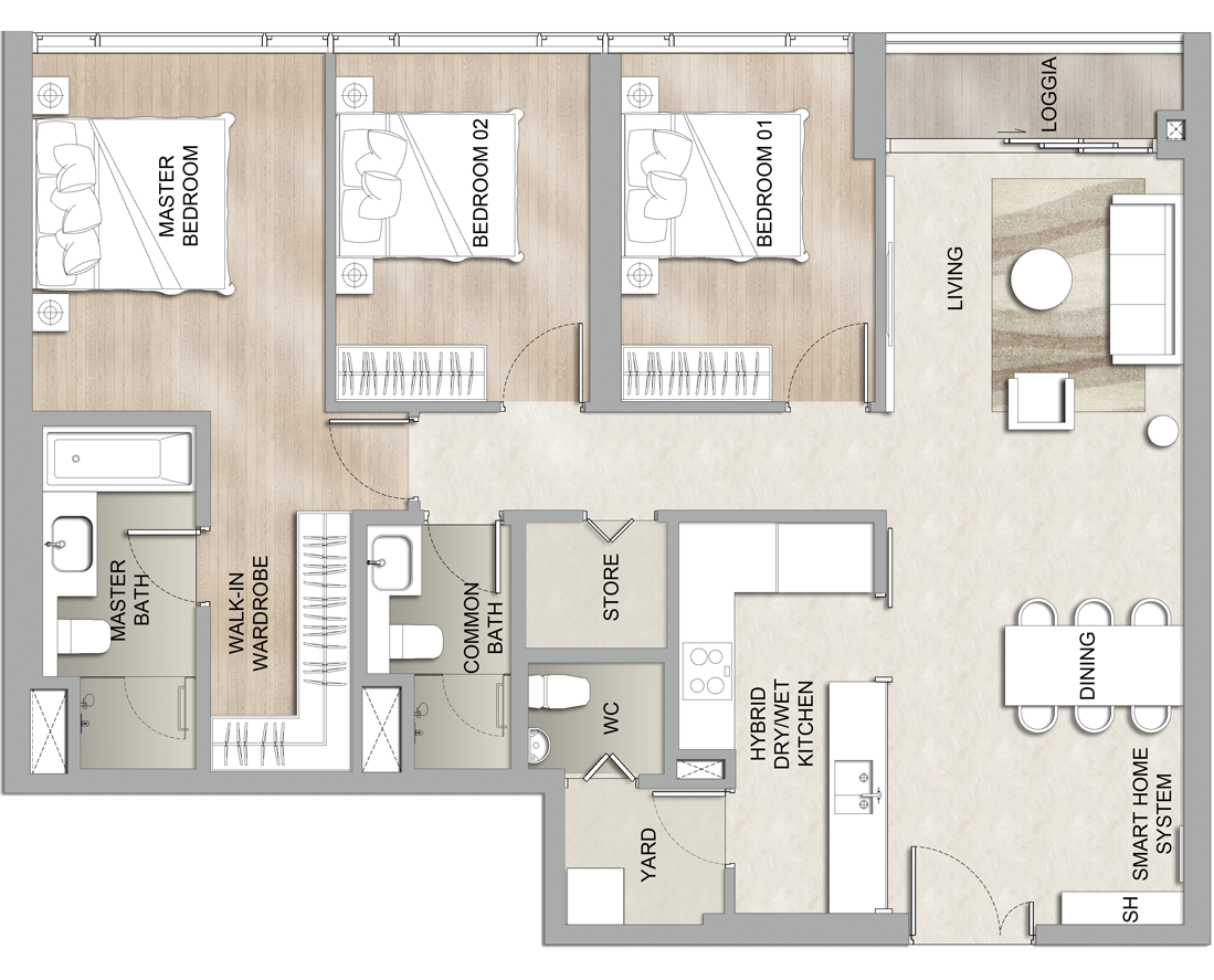 Tận hưởng không gian ấm cúng và riêng tư cùng gia đình tại căn Pearl với 3 phòng ngủ được thiết kế theo lối kiến trúc đương đại, pha lẫn các yếu tố mỹ thuật đầy màu sắc.